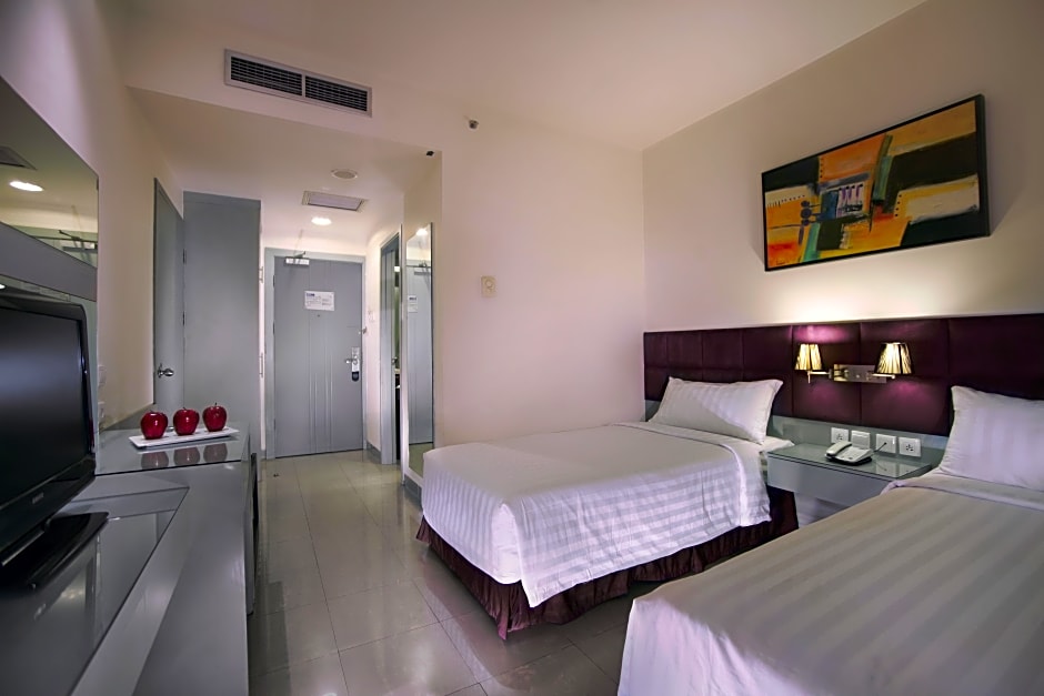 The Deluxe Double or Twin Rooms at Royal Palm Hotel & Conference Center Cengkareng offer a cozy retreat with a spacious 248 sqft layout. Boasting a non-smoking environment and accommodating up to 2 adults and 1 child, guests can enjoy a restful stay in a room featuring 1 queen-size bed and 2 twin beds. The comfortable and thoughtfully designed rooms are perfect for unwinding after a day of sightseeing or business engagements, providing all the comforts of home during your stay.